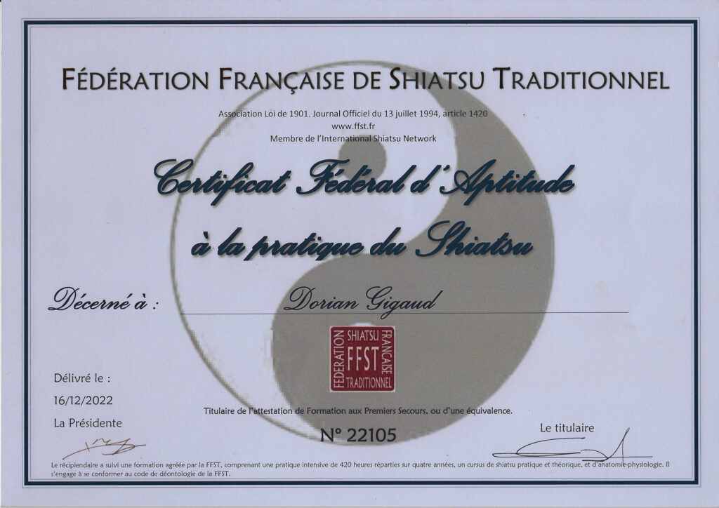Je suis diplômé en Shiatsu traditionnel par la FFST, où j’ai rédigé mon mémoire sur l’accompagnement de la sclérose en plaques par le shiatsu à l’école Shiki-Shin-Dô de la Baule. J’ai également suivi des formations en médecine et diététique traditionnelle chinoise, sur les Merveilleux Vaisseaux, et sur l’accompagnement de la fertilité par le Shiatsu, avec Myriam Corvez. Désormais, je me spécialise de plus en plus dans l’utilisation des diapasons dans le Shiatsu et la thérapie sonore en général.